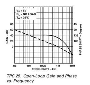 電容負(fù)載將和開環(huán)輸出阻抗一起導(dǎo)致相位和幅度延遲。電容負(fù)載上受限的頻率響應(yīng),以及如果負(fù)載電容隨電壓變化而變化時(shí)引起的信號(hào)失真。 由負(fù)載電容造成的振蕩一般可以通過提高放大器閉環(huán)增益進(jìn)行阻止。以更高的閉環(huán)增益運(yùn)行放大器意味著反饋衰減器也會(huì)衰減環(huán)路相位為±360°的頻率點(diǎn)的環(huán)路增益。帶反饋的穩(wěn)定性關(guān)鍵在于環(huán)路增益和相位;或Avol乘以反饋因子,或環(huán)路增益。如果我們?cè)趩挝辉鲆媾渲弥羞B接AD8544,那么100%的輸出電壓將被反饋。在非常低頻率時(shí),輸出是負(fù)輸入的反相,或-180°相位延遲。補(bǔ)償電路通過放大器再增加-90°延遲,使得負(fù)輸入到輸出具有-270°的延遲。當(dāng)環(huán)路相位延遲增加到±360°或它的倍數(shù)并且環(huán)路增益至少是1V/V或0dB時(shí)將產(chǎn)生振蕩。相位余量衡量的是當(dāng)增益為1V/V或0dB時(shí)相位延遲離360°有多遠(yuǎn)。通過計(jì)算,CB=3.3UF==》135°,離180°還有55°余量,這個(gè)數(shù)字是非常健康的。相位余量低至35°可能都是可用的。