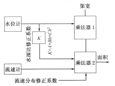 對矩形、梯形等斷面一定的明渠,利用水位測量可以求出水流的截面積。把壹臺或幾臺電磁流量計流速儀安裝在水路中,預先測量出流速儀得到的流速值和整個渠道的平均流速之間的流速分布修正系數及水深變化對流速的修正值。然后將渠寬、水深、平均流速修正系數和流速計所測量的流速值由計算機做乘法運算即可求出流量,如下圖為測量的原理框圖。