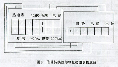 信號轉(zhuǎn)換器盤裝于控制室,氧量檢測器安裝于現(xiàn)場,它們之間連接線有:氧勢信號線兩根采用RVVP2×1.5帶屏蔽二芯電纜線敷設(shè)、電偶冷端補償導(dǎo)線兩根,采用K分度KX-G型2×1.5帶屏蔽二芯補償導(dǎo)線敷設(shè)、電爐加熱線兩根,采用RVVP2×2.5二芯電纜線敷設(shè)。 信號轉(zhuǎn)換器與氧量檢測器之間的接線見圖3。