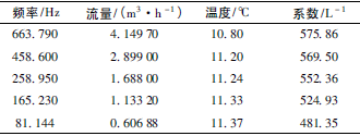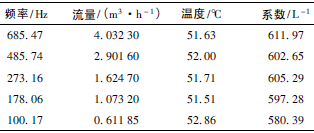根據(jù)上述檢測設備及條件,按照JJG1037—2008《渦輪流量計檢定規(guī)程》,在四種不同黏度下各檢定5個點,每點檢定3次,得到的數(shù)據(jù)如表1~表4所示,數(shù)據(jù)表中的頻率、流量、溫度、系數(shù)均為每點檢定3次各自的平均值。由表1得到儀表線性度為8.9%,儀表系數(shù)為528.61L-1;由表2得到儀表線性度為6.3%,儀表系數(shù)為553.89L-1;由表3得到儀表線性度為2.6%,儀表系數(shù)為596.18L-1;由表4得到儀表線性度為2.2%,儀表系數(shù)為622.44L-1。