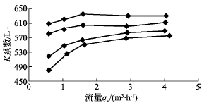 另外,從表1~表4均可看出,流量計黏度的變化對流量最小點影響也比較大,在四種不同黏度下,系數(shù)都在流量最后一點時發(fā)生了明顯的下降;而且黏度最大為93.24cSt時,系數(shù)從524.93L-1變?yōu)?81.35L-1,系數(shù)下降了43.58L-1;黏度為7.16cSt時,系數(shù)從620.88L-1變?yōu)?08.97L-1,系數(shù)僅下降了11.91L-1。從中可看出,隨著黏度的變小,對流量計下限的影響也越來越小。黏度變化對渦輪流量計特性曲線的影響如圖2所示。圖2中特性曲線從下至上依次對應表1、表2、表3和表4,儀表系數(shù)隨著黏度的升高而下降,用于較高黏度時,儀表系數(shù)與流量之間不再保持線性關(guān)系,因此,渦輪流量計測量高黏度時,必須根據(jù)黏度和流量進行修正。圖2中特性曲線的擬合公式為: