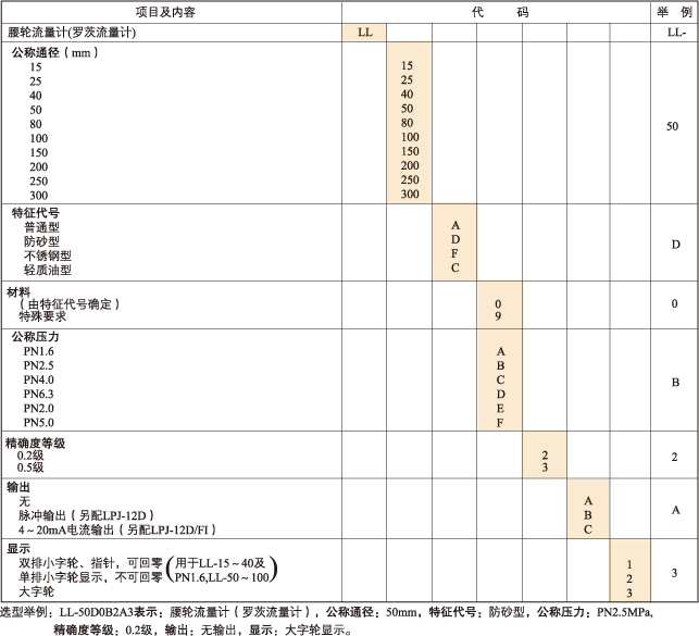 四、由選定的公稱通徑、基本誤差值(等級(jí)精度)和公稱壓力,按照“選型編碼”的內(nèi)容,選定流量計(jì)型號(hào)。